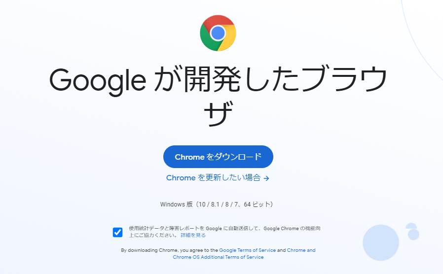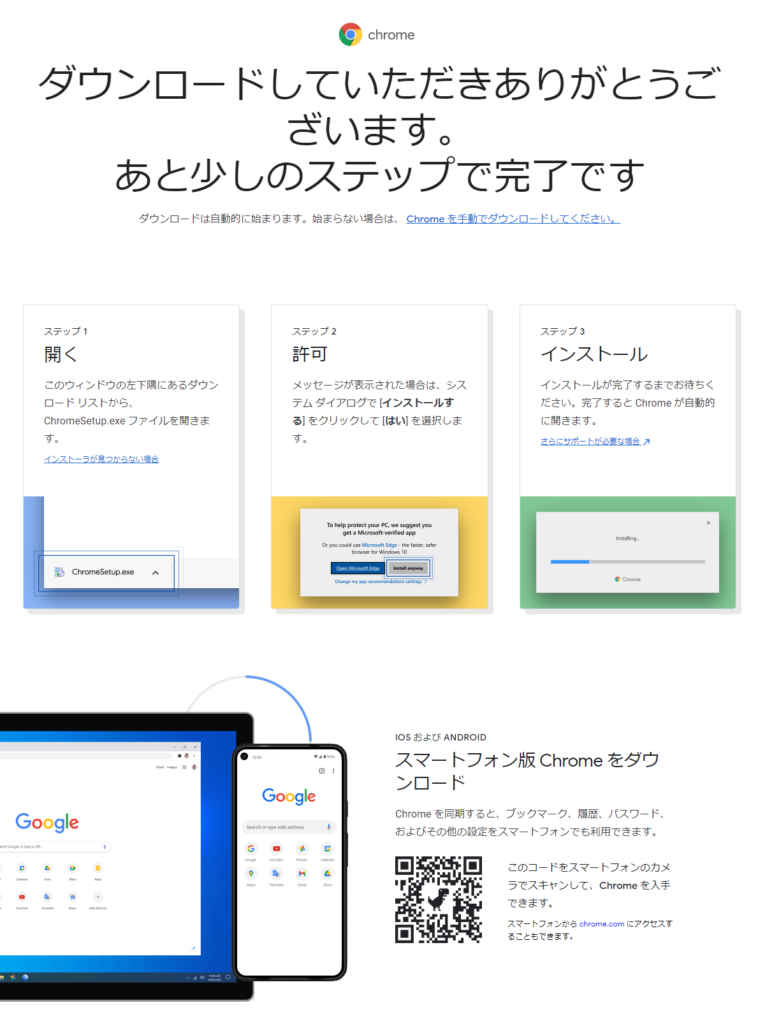 start-01 4. Google Chromeのインストール 【Google Chrome(グーグル クローム)とは?】Googleのブラウザ「Chrome」は、世界で最も利用されているWebブラウザです。ブラウザとは、スマホやPCでインターネットのWebページを閲覧するためのソフトのことで、Chromeの他にはInternet Explorer、fire fox、Safariなどがあります。 既にGoogle Chrome をお手持ちのパソコンにインストールされている場合はスルーしてもらって構いません。 Google Chromeのダウンロードページからダウンロードしてください。 ファイルをダウンロードし、「インストール」していきましょう。この時にスマートフォン版 Chrome も一緒にダウンロードしておきましょう。今後スマーフォンサイトをチェックする際にも役立ちます。 Macの場合は「アプリケーション」にインストールされたアプリが入っており、Windowsの場合にはデスクトップにショートカットが生成されているはずです。 それでは、Google Chromeを開いてみましょう。今後は何か調べたりする際や作成したWEBサイトをチェックする際に、WEBデザイナーはこのGoogle Chromeをよく使用していきますので、普段から使用して慣れていきましょう。 前に戻る 次に進む